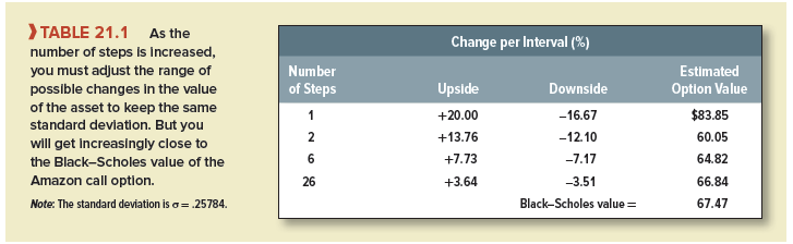 Since a stock can usually take on an almost limitless number of future values, the binomial method gives a more realistic and accurate measure of the option’s value if we work with a large number of subperiods. But that raises an important question. How do we pick sensible figures for the up and down changes in value? For example, why did we pick figures of +13.76% and -12.1% when we revalued Amazon’s option with two subperiods? Fortunately,