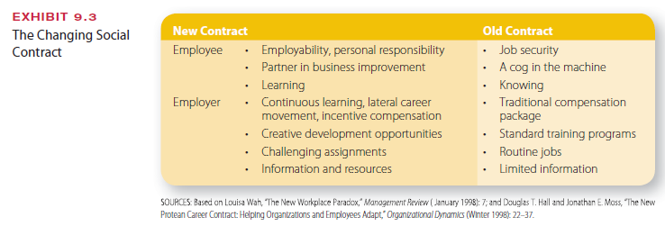 Exhibit 9.3 lists some elements of the new social contract. The new contract is based on the concept of employability rather than lifetime employment. Individuals manage their own careers; the organization no longer takes care of them or guarantees employment. Companies agree to pay somewhat higher wages and invest in creative training and devel- opment opportunities so that people will be more employable when the company no longer needs their services. Employees take more responsibility and control in their jobs, becom- ing partners in business improvement rather than cogs in a machine. In return, the organi- zation provides challenging work assignments as well as information and resources to enable people to continually learn new skills. The new contract can provide many opportu- nities for employees to be more involved and express new aspects of themselves.