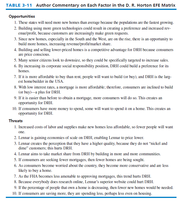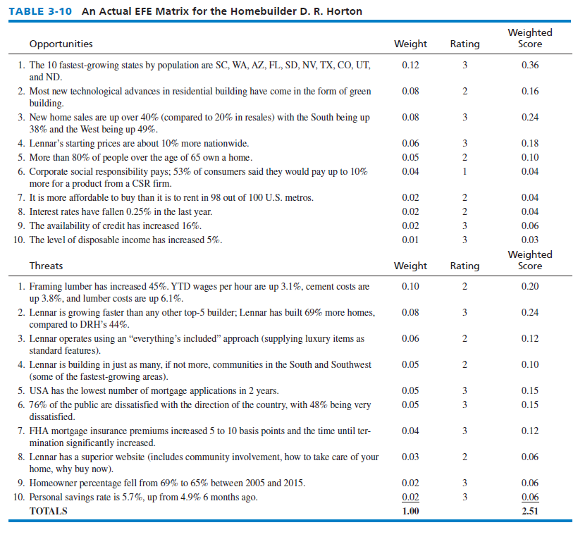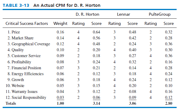 An actual CPM is provided in Table 3-13, again for the largest homebuilder in the United States, D. R. Horton. Note that the two rival firms, Lennar and PulteGroup, receive higher ratings on “Quality” than D. R. Horton. Also note the factors are listed beginning with the most important (highest weight). D. R. Horton, Lennar, and PulteGroup are headquartered in Fort Worth, Texas; Miami, Florida; and Atlanta, Georgia; respectively.