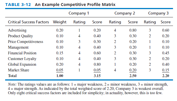 The Competitive Profile Matrix (CPM) identifies a firm’s major competitors and its particular strengths and weaknesses in relation to a sample firm’s strategic position. The weights and total weighted scores in both a CPM and an EFE have the same meaning. However, critical success factors in a CPM include both internal and external issues; therefore, the ratings refer to strengths and weaknesses, where 4 = major strength, 3 = minor strength, 2 = minor weakness, and 1 = major weakness. The critical success factors in a CPM are not grouped into opportunities and threats as they are in an EFE. In a CPM, the ratings and total weighted scores for rival firms can be compared to the sample firm. This comparative analysis provides important internal strategic information. Avoid assigning the same rating to firms included in your CPM analysis.