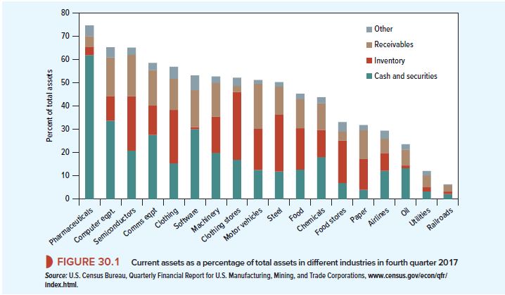 Figure 30.1 shows the relative importance of working capital in different industries. For example, current assets account for nearly 75% of total book assets of pharmaceutical companies but less than 10% of total book assets of railroads. For some industries, current assets means principally inventory; for others, it means accounts receivable or cash and securities. Retail firms hold large inventories. Receivables are relatively more important for auto producers. Cash and securities make up the bulk of current assets of computer and pharmaceutical companies.