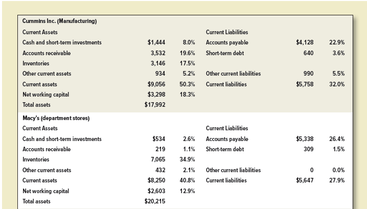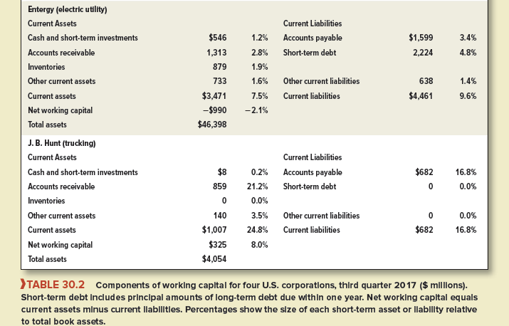 Table 30.2 presents working-capital balance sheets for four U.S. corporations: Cummins, a manufacturer, mostly of diesel engines; Macy’s department stores; electric utility Entergy; and trucking company J. B. Hunt.
