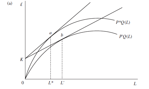 Figure 10.4 may help to clarify the differences between the conventional analysis of Meade (1972) and that of Kahana and Nitzan (1993). Meade’s analysis is presented in part (a) of Figure 10.4. The two curves P*Q(L) and P Q(L) show total revenue as the size of the team varies for two different price levels (P* >P’). K represents fixed capital charges. The slopes of the straight lines out of point K through points a and b represent the distributable surplus per worker at those points. For price level P’, this surplus per worker is maximised at b and the size of team is L’. For price level P*, surplus per worker is maximised at a, where the size of team is L*. The higher price level leads to a smaller firm.