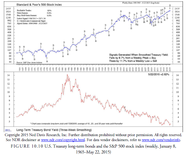 Ned Davis Research developed a simple trading rule for long-term interest rates. It is the number of points a three-week moving average changes, up or down. If the long-rate measure declines by 8.7% from a weekly peak, a buy signal is generated. On the other hand, a sell signal is generated when the long-term rate average advances 11.7% from a weekly low. The performance history of this simple method produced an average annual return of 9.8% in the S&P 500 over the past 50 years. This is compared with a buy-and-hold gain of only 6.6%.