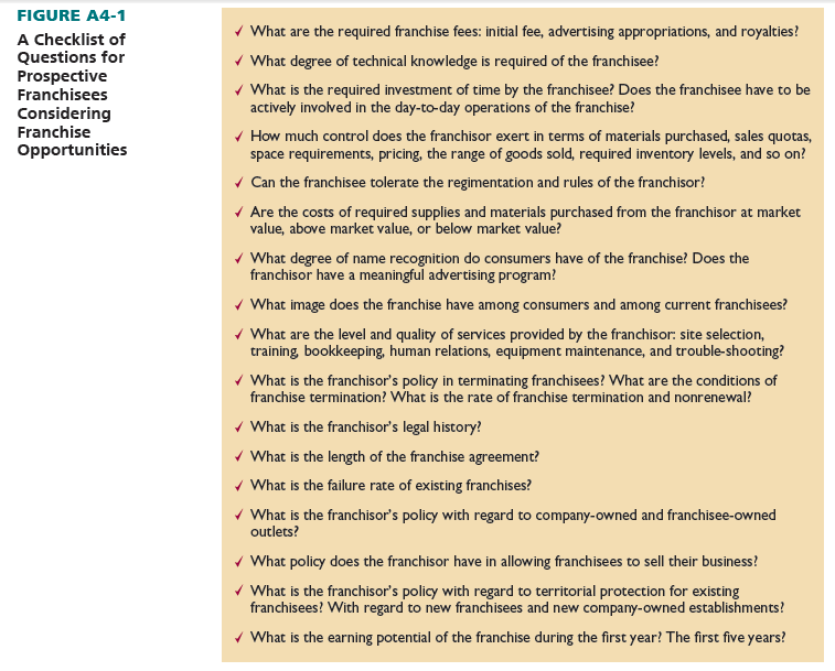 Figure A4-1 has a checklist by which potential franchisees can assess opportunities. In using the checklist, franchisees should also obtain full prospectuses and financial reports from all franchisors under consideration, and talk to existing franchise operators and customers.