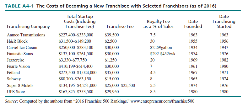 Table A4-1 shows the franchise fees, startup costs, and royalty fees for new franchisees at 10 leading franchisors in various business categories. Financing support—either through in-house financing or third-party financing—is offered by most of the firms cited in Table A4-1. In addition, with its guaranteed loan program, the U.S. Small Business Administration is a good financing option for prospective franchisees, and some banks offer special interest rates for franchisees affiliated with established franchisors.