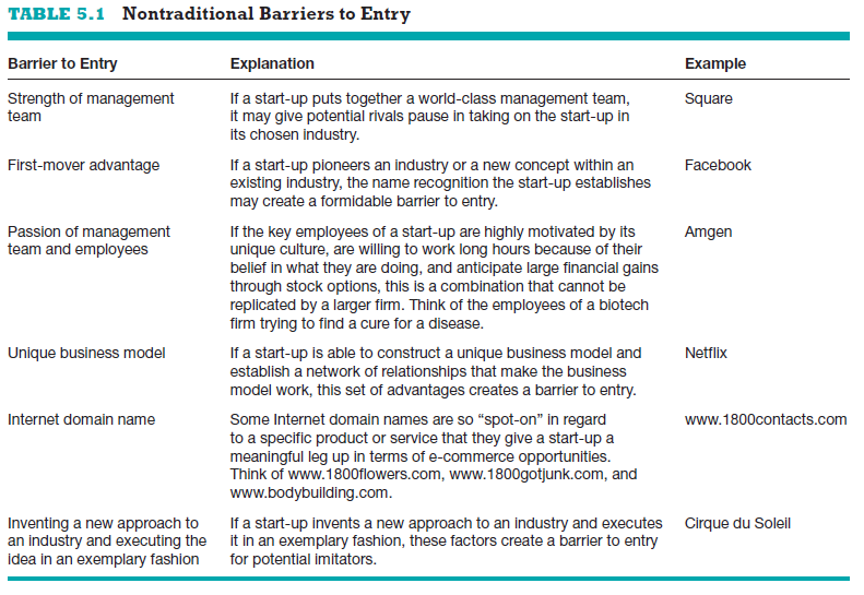 When start-ups create their own industries or create new niche markets within existing industries, they must create barriers to entry of their own to reduce the threat of new entrants. It is difficult for start-ups to create barriers to entry that are expensive, such as economies of scale, because money is usu- ally tight. The biggest threat to a new firm’s viability, particularly if it is creating a new market, is that larger, better-funded firms will step in and copy what it is doing. The ideal barrier to entry is a patent, trademark, or copyright, which prevents another firm from duplicating what the start-up is doing. Companies like Greenvelope typically have trade secrets associated with the functionality of their websites; in turn, trade secrets create a barrier to entry for a firm think- ing about emulating the service provided by firms holding those secrets. The strength of Greenvelope’s brand and the network of freelance designers and artists that it has assembled to create its invitations are also aspects of its busi- ness model that would be difficult to copy. Apart from these types of options, however, start-ups have to rely on nontraditional barriers to entry to discourage new entrants, such as assembling a world-class management team that would be difficult for another company to replicate. In Table 5.1, we provide a list of nontraditional barriers to entry that are particularly suited to start-up firms.