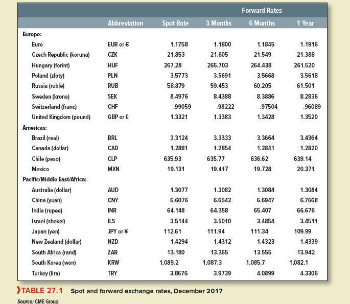 Table 27.1 shows a sample of exchange rates in December 2017. Exchange rates are generally expressed in terms of the number of units of the foreign currency needed to buy one U.S.dollar (USD). This is termed an indirect quote. In the first column of Table 27.1, the indirect quote for the Brazilian real shows that you could buy 3.3124 reals for $1. This is often written