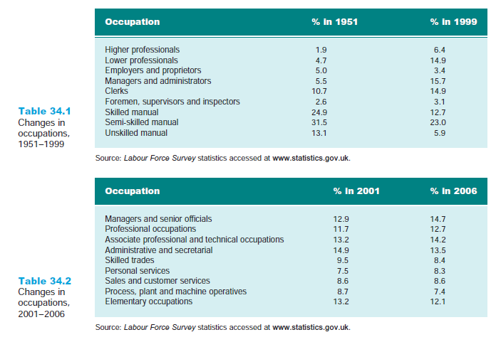 But what sort of skills will employers be looking for? Here too long-term trends paint a clear picture which there is every reason to believe will continue for the foreseeable future. The official method used to classify occupations in the UK was changed in 1999, so it is not possible to make a precise comparison of today’s figures with those produced by government statisticians before then. Nonetheless an obvious long-term pattern can be seen in the two sets of statistics presented in Tables 34.1 and 34.2. These show a pronounced switch occurring over a long period of time, and continuing strongly in more recent years, away from skilled, semi-skilled and unskilled manual work towards jobs which require higher-level and more specialised skills. The major growth areas have long been in the professional, technical and managerial occupations.
