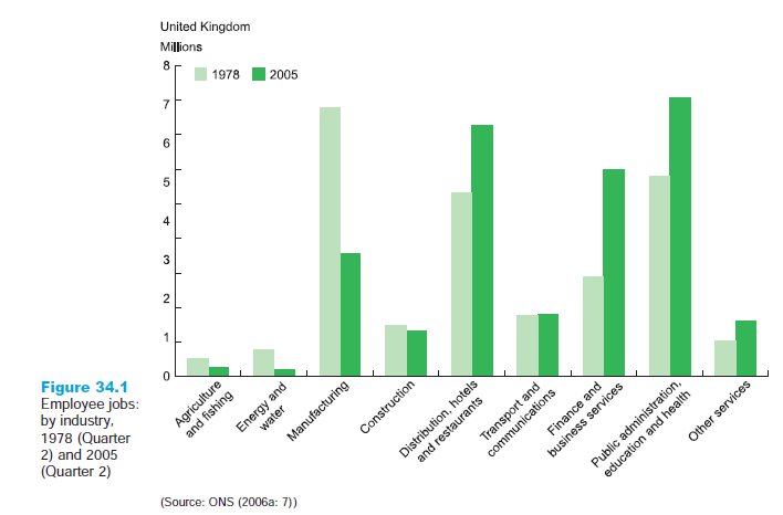 The change in the occupational profile of the UK workforce has largely been driven by the revolutionary shift that has occurred in the nature of our industries during the past thirty years. In 1978, which was the first year that data was collected on employment by sector, seven million people worked in manufacturing and a further one and a half million in the energy, water, farming and fishing industries. These have all hugely declined since then. Manufacturing now employs only three million (12 per cent of all jobs). Agriculture and fishing account for just 200,000 jobs; energy and water for fewer still (see Figure 34.1). The big growth areas have been in retailing, distribution, hotels and restaurants, finance, business services, public administration, education and health. Employment in the financial services sector has grown especially quickly, more than doubling since 1978.