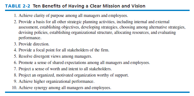 In multidivisional organizations, strategists should ensure that divisional units perform strategic-management tasks, including the development of a statement of vision and mission. Each division should involve its own managers and employees in developing a vision and mission statement that is consistent with and supportive of the corporate mission. Ten benefits of having a clear mission and vision are provided in Table 2-2.
