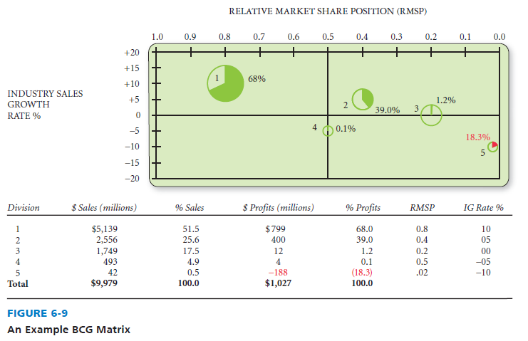 An example five-division IE Matrix is given in Figure 6-12. Note that Division 1 has the largest revenues (as indicated by the largest circle) and the largest profits (as indicated by the largest pie slice) in the matrix. It is common for organizations to develop both geographic and product-based IE Matrices to more effectively formulate strategies and allocate resources among divisions. Firms often prepare a “before and after” IE (or BCG) Matrix to reveal the situation at present versus the expected situation after one year. This latter idea minimizes the limitation of these matrices being a “snapshot in time.”