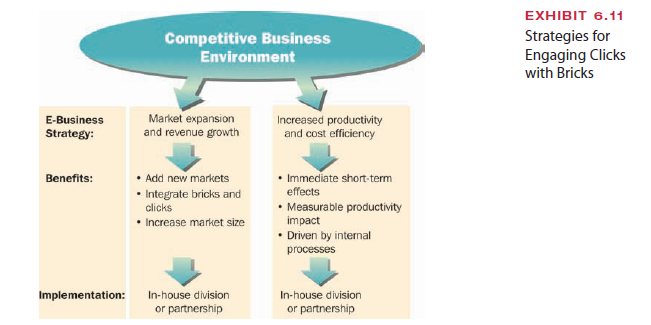 The first step toward a successful e-business is for managers to determine why they need such a business to begin with.103 Failure to align the e-business initiative with corporate strategy can lead to e-business failure. Two basic strategic approaches for traditional orga- nizations setting up an Internet operation are illustrated in Exhibit 6.11. Some companies embrace e-business primarily to expand into new markets and reach new customers. Others use e-business as a route to increased productivity and cost efficiency. As shown in the exhibit, these strategies are implemented either by setting up an in-house Internet division or by partnering with other organizations to handle online activities.
