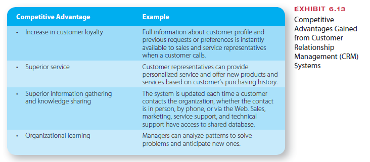 Increasingly, what distinguishes an organization from its competitors are its knowledge resources, such as product ideas and the ability to identify and find solutions to customers’ problems. Exhibit 6.13 lists examples of how CRM and other IT can shorten the distance between customers and the organization, contributing to organizational success through cus- tomer loyalty, superior service, better information gathering, and organizational learning.
