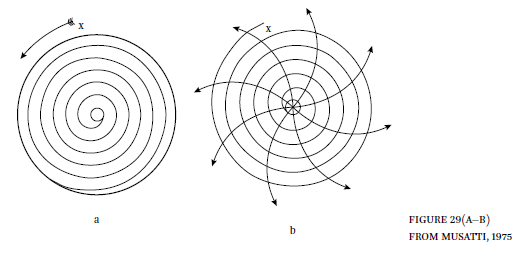 The circular motion is thus decomposed into a visible radial and an invisible rotational component along the spiral itself. If the pitch of the spiral is very small, the rotation disappears completely (see Wertheimer, 1912a). Therefore, at a slow rotation of the disc the spiral appears simply subject to an inward and outward motion. However, this is not generally the case and the rotational component often remains partially visible. Unlike circular figures, the stability of orientation of the spiral does not coincide with the minimal trajectory of the points. For any point, the minimal trajectory is orthogonal to the tangent of the spiral at that point and it bends from the center to the periphery in the direction of its actual rotation (see figure 29b). The perceptual identification of the points moving along the minimal trajectories brings about the additional component of phenomenal expansion or contraction. This is so conspicuous that the diameter of the surface, on which the spiral expands (or contracts), is seen to vary accordingly and the surface appears to be globally enlarged or shrunk. Sometimes two further spatial transformations occur on the grounds of this kind of apparent expansion and contraction. The expanding spiral appears to approach the observer together with the surface of the disc, while the contracting spiral appears to recede from her. The rotational motion on the plane is thus transformed in a depth shift. The rotation can also be changed into a full- fledged movement in the third dimension. In this case, the spiral detaches itself from the surface of the disc. If expanding, it appears to approach the observer while rotating in depth from the farther center to the nearer periphery. If contracting, the spiral appears to recede while rotating and converge from the nearer periphery to the farther center. This movement in depth of a configuration in the third dimension has the paradoxical property that the spiral approaches the observer without ever reaching a definite position. The spiral looks like an endless screw. Yet, this phenomenon seldom occurs. In general, the spatial properties of the rotating spiral differ manifestly from those of an object-like appearance or a full-fledged solid body. Instead, a proper three-dimensional phenomenon arises with a hyperbolic spiral (see figure 30).