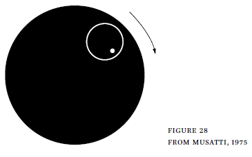 Musatti shows that the disappeared rotational component can become visible again. If a single circle is drawn eccentrically on a disc like in figure 28, the stability of orientation induces a perceptual decomposition of motion.