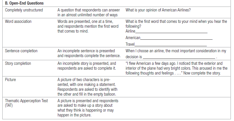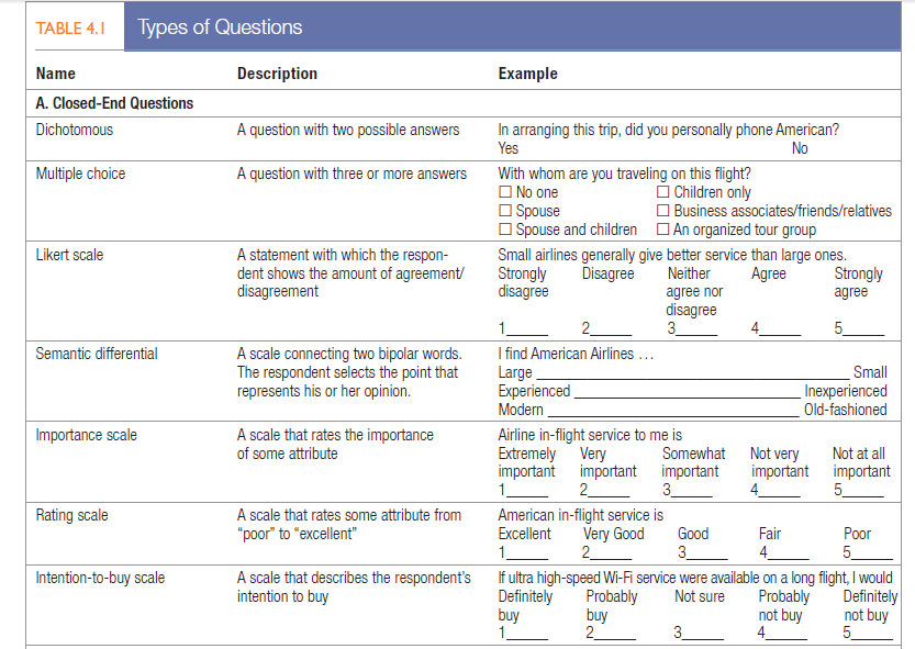 Questionnaires A questionnaire consists of a set of questions presented to respondents. Because of its flexibility, it is by far the most common instrument used to collect primary data. The form, wording, and sequence of the questions can all influence the responses, so testing and de-bugging are necessary. Closed-end questions specify all the possible answers, and the responses are easier to interpret and tabulate. Open-end questions allow respondents to answer in their own words. They are especially useful in exploratory research, where the researcher is looking for insight into how people think rather than measuring how many think a certain way. Table 4.1 provides examples of both types of questions; also see “Marketing Memo: Questionnaire Dos and Don’ts.”