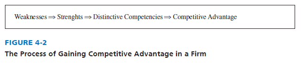 Strengths that cannot be easily matched or imitated by competitors are called distinctive competencies. Building competitive advantages involves taking advantage of distinctive competencies. Strategies are designed in part to improve on a firm’s weaknesses, turning them into strengths—and maybe even into distinctive competencies. Figure 4-2 illustrates that all firms should continually strive to improve on their weaknesses, turning them into strengths, and ultimately develop distinctive competencies that can provide the firm with competitive advantages over rival firms.