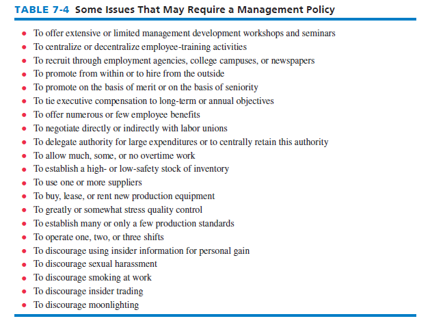Examples of policies that support a company strategy, a divisional objective, and a departmental objective are given in Table 7-3. Some example issues that may require a management policy are provided in Table 7-4.