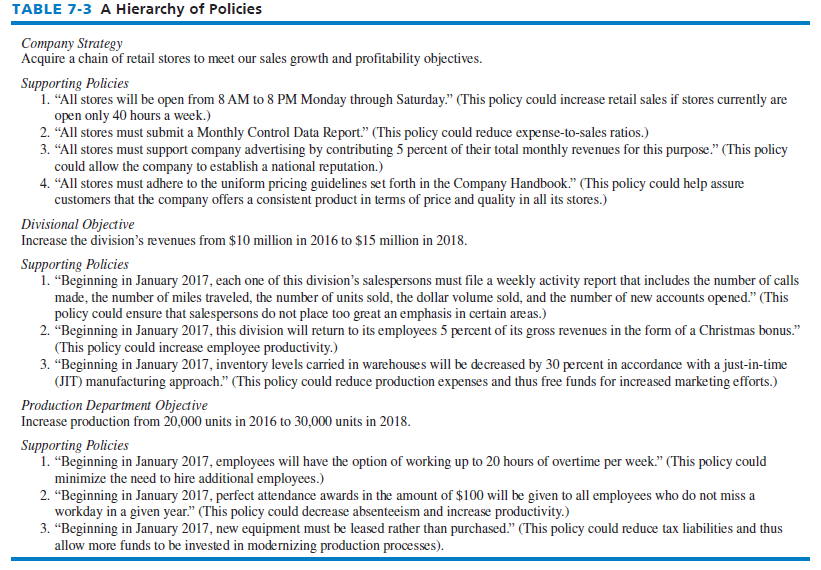 Examples of policies that support a company strategy, a divisional objective, and a departmental objective are given in Table 7-3. Some example issues that may require a management policy are provided in Table 7-4.