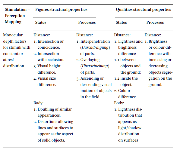 Metzger (1957) says that the phenomenological study of visual space is in accord with the naive realism of everyday life, though this claim should not be taken as an ontological commitment. It means that if the space of experience is studied solely on phenomenological grounds, the experimental evidence will show that it is primarily a space of things, which are perceived in a visual field where height, width and depth are equally presented. This claim also has important implications for the interpretation of well-known mechanisms underlying depth perception, such as binocular disparity, whose function is specifying the spatial features of appearances rather than recovering the third dimension from two-dimensional retinal images. For instance, Metzger (1966a) claims that if monocular vision is considered in this phenomenological sense it is shown in reality to provide fundamental clues for experiencing depth, but it has often been neglected when intended only as a mechanism to recover three-dimensional properties. Moreover, these clues form an ordered manifold that can be represented in table 2.