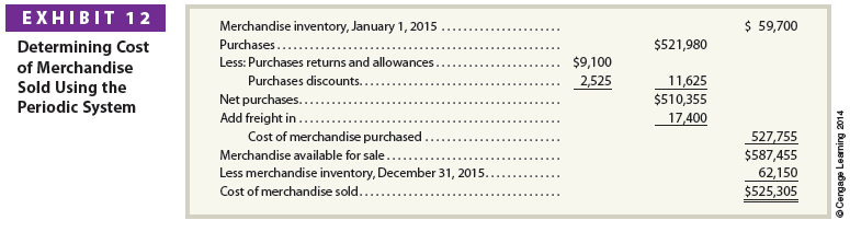 Using the periodic inventory system, purchases of inventory are not recorded in the merchandise inventory account. Instead, purchases, purchases discounts, and purchases returns and allowances accounts are used. In addition, the sales of merchandise are not recorded in the inventory account. Thus, there is no detailed record of the amount of inventory on hand at any given time. At the end of the period, a physical count of merchandise inventory on hand is taken. This physical count is used to determine the cost of merchandise sold as shown in Exhibit 12.