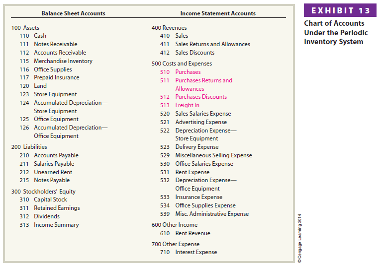 The chart of accounts under a periodic inventory system is shown in Exhibit 13. The accounts used to record transactions under the periodic inventory system are highlighted in Exhibit 13.