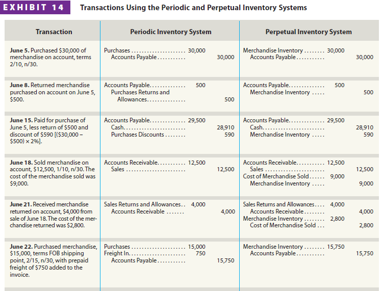 Exhibit 14 illustrates the recording of merchandise transactions using the periodic system. As a review, Exhibit 14 also illustrates how each transaction would have been recorded using the perpetual system.