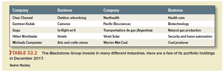 A conglomerate is a firm that diversifies across a number of unrelated businesses. Is Black- stone a conglomerate? Table 32.2, which lists some of Blackstone’s holdings, suggests that it is. Blackstone funds have invested in dozens of industries.