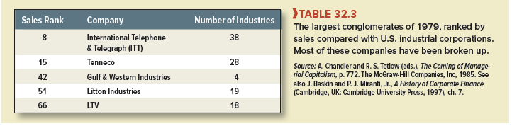 Conglomerates were fashionable in the 1960s when a merger boom created more than a dozen sprawling conglomerates. Table 32.3 shows that by the 1970s, some of these conglomerates had achieved amazing spans of activity. The largest conglomerate, ITT, was operating in 38 different industries and ranked eighth in sales among U.S. corporations.