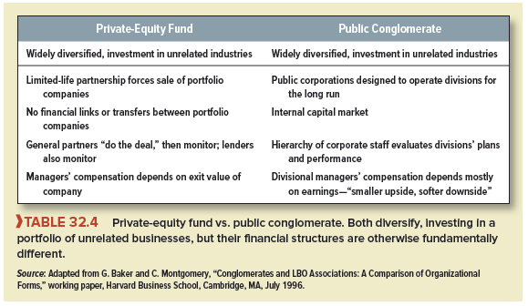 Table 32.4 summarizes a comparison by Baker and Montgomery of the financial structure of a private-equity fund and of a typical public conglomerate. Both are diversified, but the fund’s limited partners do not have to worry that free cash flow will be plowed back into unprofitable investments. The fund has no internal capital market. Monitoring and compensation of management also differ. In the fund, each company is run as a separate business. The managers report directly to the owners, the fund’s partners. Each company’s managers own shares or stock options in that company, not in the fund. Their compensation depends on their firm’s market value in a trade sale or IPO.