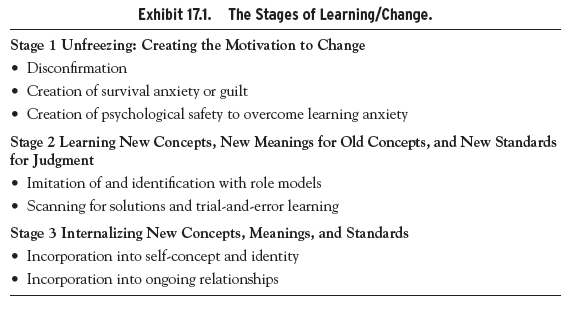The fundamental assumptions underlying any change in a human system are derived originally from Kurt Lewin (1947). I have elaborated and refined his basic model in my studies of coercive persuasion, professional education, group dynamics training, and management development (Schein, 1961a, 1961b, 1964, 1972; Schein and Bennis, 1965). This elaborated model is shown in Exhibit 17.1