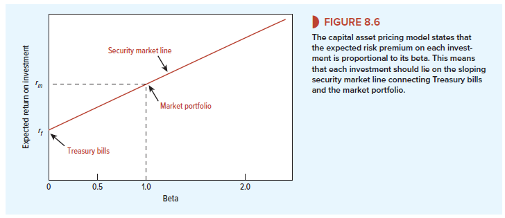 In the mid-1960s three economists—William Sharpe, John Lintner, and Jack Treynor— produced an answer to this question.[2] Their answer is known as the capital asset pricing model, or CAPM. The model’s message is both startling and simple. In a competitive market, the expected risk premium varies in direct proportion to beta. This means that in Figure 8.6 all investments must plot along the sloping line, known as the security market line. The expected risk premium on an investment with a beta of .5 is, therefore, half the expected risk premium on the market; the expected risk premium on an investment with a beta of 2 is twice the expected risk premium on the market. We can write this relationship as