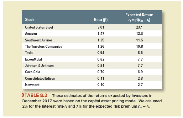 Table 8.2 puts these numbers together to give an estimate of the expected return on each stock. The stock with the highest beta in our sample is U.S. Steel. Our estimate of the expected return from U.S. Steel is 22.3%. The stock with the lowest beta is Newmont. Our estimate of its expected return is just 2.7%. Notice that these expected returns are not the same as the hypothetical forecasts of return that we assumed in Table 8.1 to generate the efficient frontier. They are the returns that investors can expect if the stocks are fairly priced.