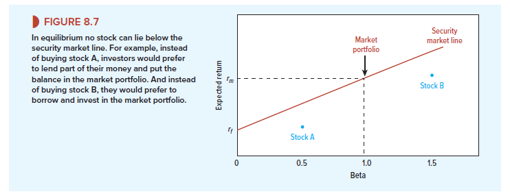 What about stock B in Figure 8.7? Would you be tempted by its high return? You wouldn’t if you were smart. You could get a higher expected return for the same beta by borrowing 50 cents for every dollar of your own money and investing in the market portfolio. Again, if everybody agrees with your assessment, the price of stock B cannot hold. It will have to fall until the expected return on B is equal to the expected return on the combination of borrowing and investment in the market portfolio.[6]