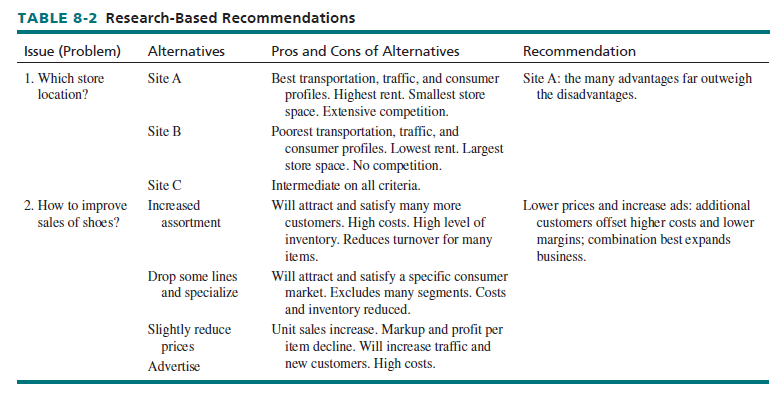 At this point, the pros and cons of each alternative are enumerated. See Table 8-2. Recommendations are then made as to the best strategy for the firm. Of the available options, which is best? Table 8-2 also shows recommendations for the shoe-store issues discussed in this section.