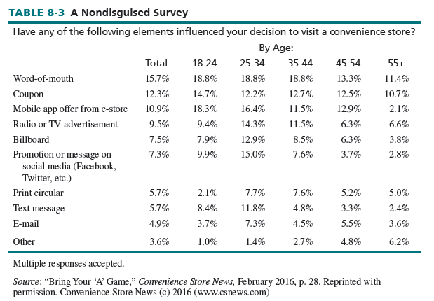 A survey may be nondisguised or disguised. In a nondisguised survey, the respondent is told the real purpose of the study. In a disguised survey, the respondent is not told the true purpose so that person does not answer what he or she thinks a firm wants to hear. Disguised surveys use word associations, sentence completions, and projective questions (such as, “Do your friends like shopping at this store?”). See Table 8-3.