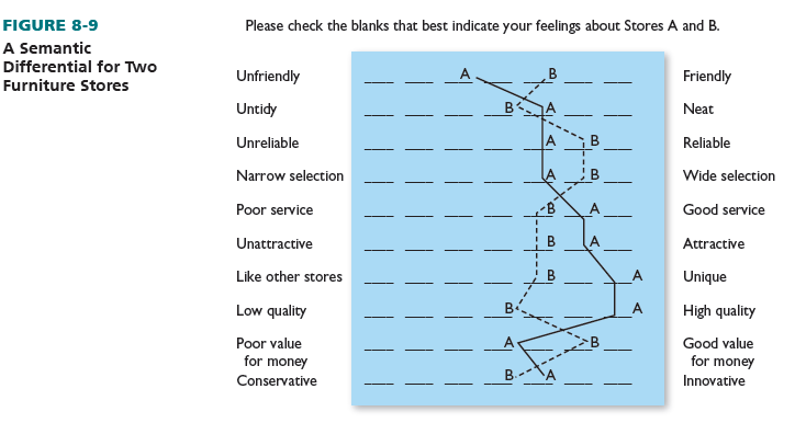 The semantic differential—a listing of bipolar adjective scales—is a survey format that may be disguised or nondisguised. A respondent is asked to rate one or more retailers on several criteria, each evaluated by bipolar adjectives (such as unfriendly-friendly). By computing the average rating of all respondents for each criterion, an overall profile emerges. Figure 8-9 shows a semantic differential comparing two furniture retailers. Retailer A is a prestigious, high-quality store and retailer B is a mid-quality, family-run store. The semantic differential graphically portrays their images.