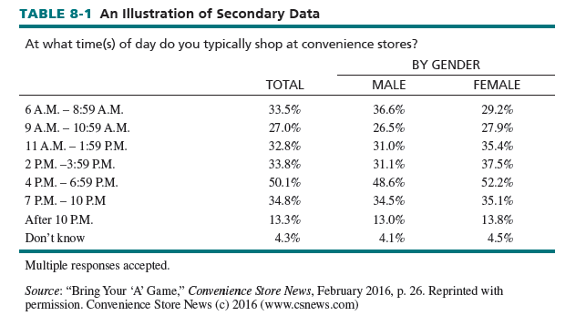 Convenience Store News conducted a study of what time of day people most often visit convenience stores. Its 2016 “Realities of the Aisle” consumer research studied 1,501 people who shopped at least one time in the prior month. By the time you read this, the data in Table 8-1 will be secondary data in nature.19