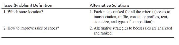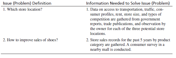 Issue (problem) definition involves a clear statement of the topic to be studied. What information does the retailer want to obtain to make a decision? Without clearly knowing the topic to be researched, irrelevant and confusing data could be collected. Here are examples of issue definitions for a shoe store. The first one seeks to compare three locations and is fairly structured; the second is more open-ended: (1) “Of three potential new store locations, which should we choose?” (2) “How can we improve the sales of our men’s shoes?”