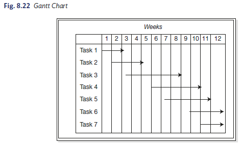 Example: The Gantt chart shown in Figure 8.22 has been used for many years to permit visualization and scheduling of parallel activities. In Figure 8.22, tasks are listed on the right side of the diagram. The time during which the tasks are scheduled are shown by the extent of the arrows in the diagram. The abscissa in this example might be weeks or months. In contrast, the arrow diagram attaches the name of each task to a node and shows the times between the tasks. Parallelism is easily seen and, moreover, disconnects in time are easily observed so that delays can be identified and plans can be altered to achieve the minimum time from start to completion of the process.