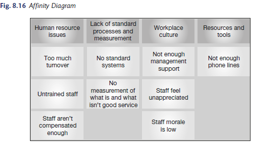 Using the affinity diagram as a team: It is relatively simple to try out using affinity diagrams yourself using the steps mentioned above. Figure 8.16 is an affinity diagram that shows the reason for substandard customer service. Use the steps shown below to do this.