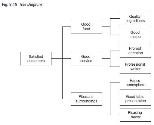 Example: A hotel restaurant manager, concerned at low patronage figures and various vague complaints, wanted to identify the factors that affected the satisfaction of her customers so that areas for improvement might be identified. She decided to use a tree diagram to find a basic set of factors, which when taken together would cover all areas.