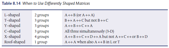 - A T-shaped matrix: It relates three groups of items. Groups B and C are each related to A. Groups B and C are not related to each other.