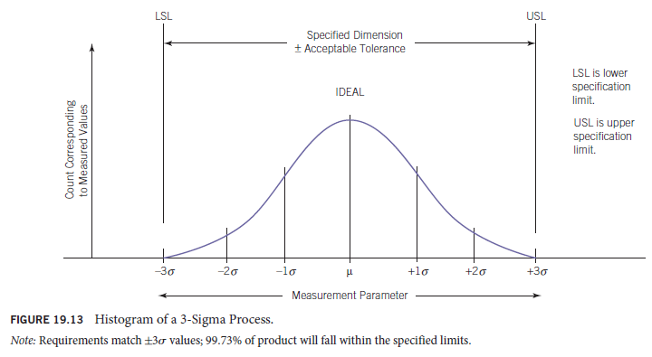The well-controlled processes of most good companies presently operate between 3 and 4 sigma. This means 99.73% of the output of a process will fall between plus and minus three standard deviations at 3 sigma, or 99.9937% at 4 sigma. If the specification (such as a required dimension with a tolerance) for parts produced by the process should correspond to the ±3a values, then a 3-sigma process will yield 2,700 defective parts for every 1 million produced. (See Figure 19.13.)