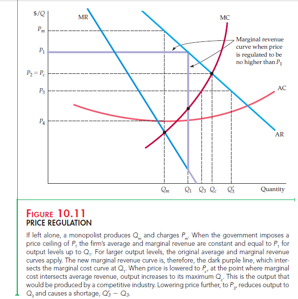 Figure 10.11 illustrates price regulation. Pm and Qm are the price and quantity that result without regulation—i.e., at the point where marginal revenue equals marginal cost. Now suppose the price is regulated to be no higher than P1. To find the firm’s profit-maximizing output, we must determine how its average and marginal revenue curves are affected by the regulation.