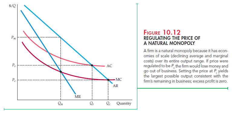 Note in Figure 10.12 that because average cost is declining everywhere, mar- ginal cost is always below average cost. If the firm were unregulated, it would produce Qm and sell at the price Pm. Ideally, the regulatory agency would like to push the firm’s price down to the competitive level Pc. At that level, however, price would not cover average cost and the firm would go out of business. The best alternative is therefore to set the price at Pr, where average cost and average revenue intersect. In that case, the firm earns no monopoly profit, while output remains as large as possible without driving the firm out of business.
