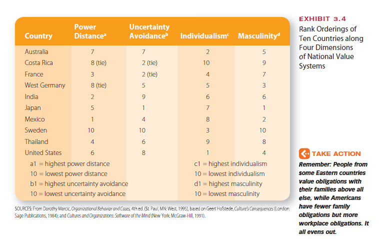 In research that included 116,000 IBM employees in 40 countries, Geert Hofstede identified four dimensions of national value systems that influence organizational and em- ployee working relationships.36 Examples of how countries rate on the four dimensions are shown in Exhibit 3.4.