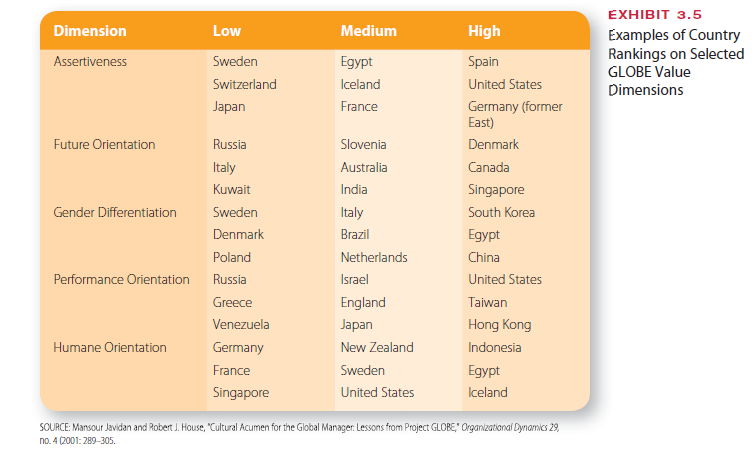 Exhibit 3.5 gives examples of how some countries rank on several of the GLOBE dimensions. These dimensions offer managers an added tool for identifying and managing cultural differences. Although Hofstede’s dimensions are still valid, the GLOBE research provides a more comprehensive view of cultural similarities and differences.