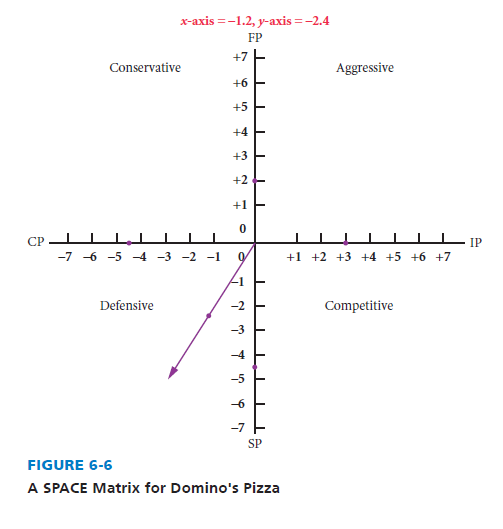A SPACE Matrix for Domino’s Pizza, Inc. is provided in Figure 6-6. Note the SPACE vector for Domino’s is located in the Competitive Quadrant (lower right), based primarily on three factors: (1) the company’s $1.5 billion in long-term debt, (2) intense competition within the fast-food industry, and (3) offering products that are generally not a healthy food choice. Domino’s should consider adding a line of salads to their menu to shift the SPACE vector into the Aggressive Quadrant (upper right); adding salads would likely benefit Domino’s financially, thus moving the SPACE point on the vertical (y-axis) up.